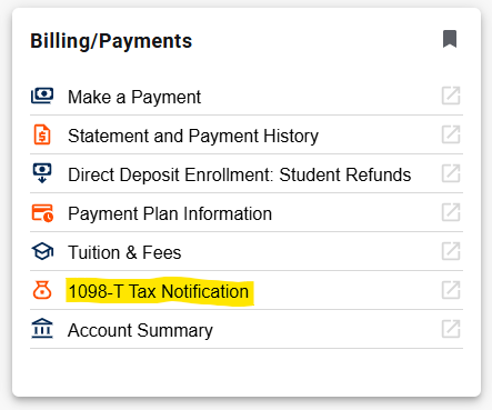 4. Select 1098-T Tax Notification option under the Billing/Payments card. This will pull you to Touchnet: