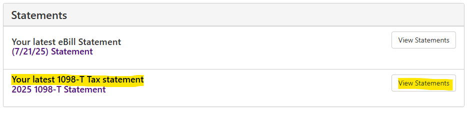 5. Once Touchnet loads, scroll down and look for the 1098-T Tax Statement under the Statements heading and click View Statements:
