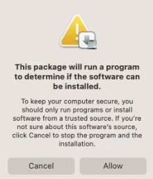 If prompted, “the package will run a program to determine if the software can be installed.” Choose “Allow”.