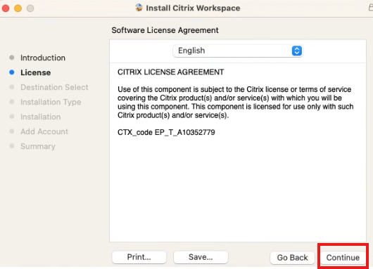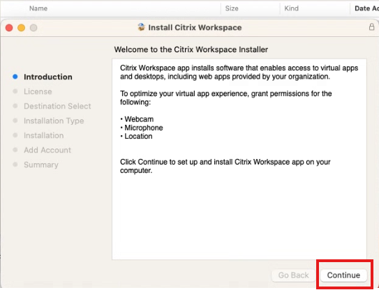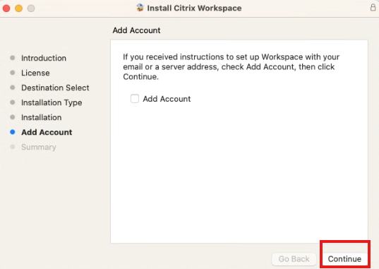 8. On the Install Citrix Workspace screen choose “Continue”: