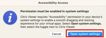 22. After launching an application, you may get prompted with an accessibility access prompt. Click “Open system settings”: