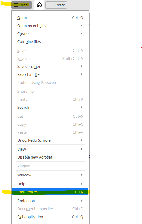 - In Acrobat, click on MENU in the upper left corner and then click preferences: