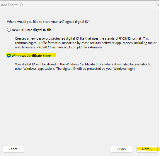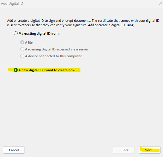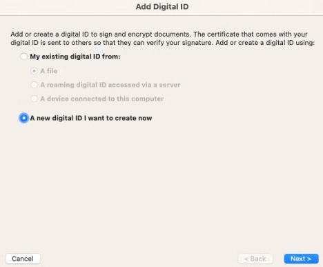 Select the option A New Digital ID I Want To Create Now, and click Next.