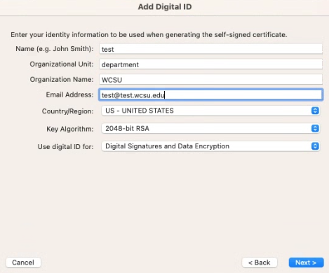 - Bullet “A new digital ID that I want to create now” and click Next: