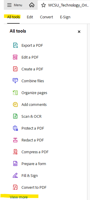 1. Open your pdf and click on view more within All Tools on the left hand side: