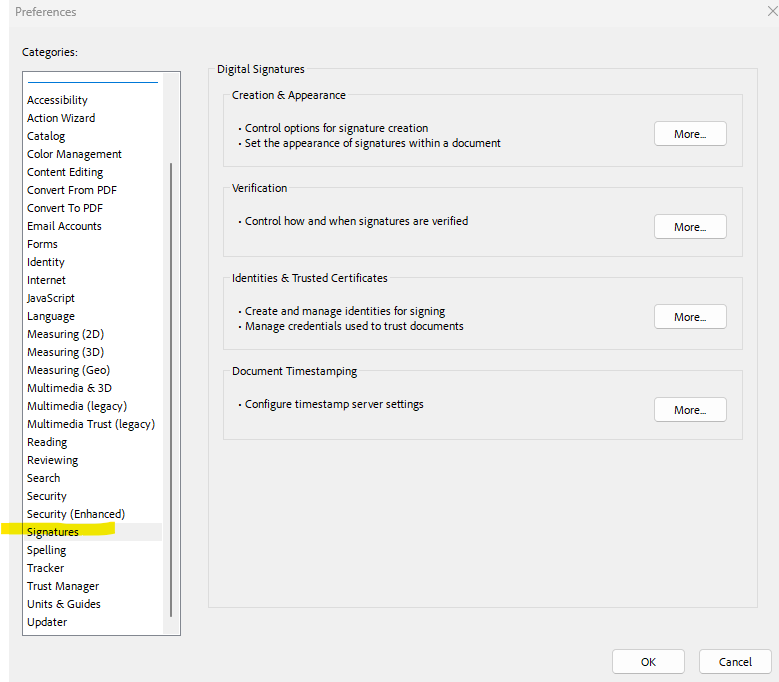 - Scroll down and select Signatures then on the right, click More by Identities & Trusted Certificates.