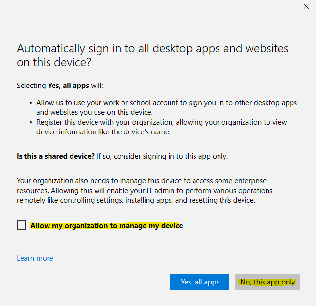 8. This prompt will appear after entering your WCSU password. Make sure to uncheck the box above Allow my organization to manage my device. Then select No, sign in to this app only.